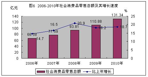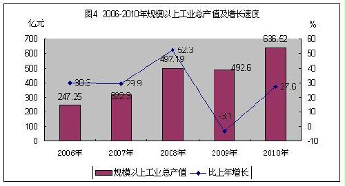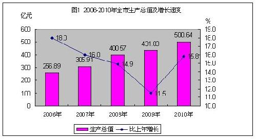 经初步核算,2010年全市生产总值为500.64亿元,比上年增长15.8%。分产业看,第一产业增加值为30.25亿元,增长6.2%;第二产业增加值为303.22亿元,增长17.9%,其中工业增加值278.58亿元,增长18.1%;第三产业增加值为167.17亿元,增长14%,其中,批发和零售业增长24.2%,住宿和餐饮业增长24.7%,交通运输、仓储和邮政业增长14%。