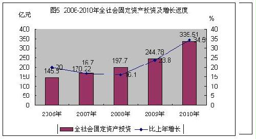 固定资产投资保持高速增长。全年全社会固定资产投资总额完成335.51亿元,比上年增长34.47%,净增加90.73亿元。其中,基本建设投资完成118.01亿元,增长15.2%;更新改造投资完成47.81亿元,增长28.8%。