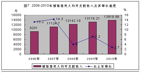 城镇居民收入继续增长。2010年,全市城镇居民人均可支配收入13918.98元,扣除物价因素,比上年实际增长2.7%。城镇居民人均消费性支出8357.92元,实际增长3.4%,分支出类别看,食品类增长5.2%,家庭设备用品及服务类下降10.9%,交通通讯类增长1.8%,教育文化娱乐服务类下降12%,医疗保健类下降6.9%,居住类增长24.9%。年末,城镇居民家庭拥有家用汽车、电脑等高档耐用消费品的数量有所增加。