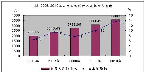 农民人均纯收入大幅提高。2010年,全市农民人均纯收入3600.50元,扣除物价因素,比上年实际增长13.8%。农民生活质量进一步提高,人均生活消费支出2612.44元,实际增长1.7%。分支出类别看,食品支出1369.8元,增长16.8%;居住支出286.3元,下降40.5%;交通和通讯支出206.5元,增长12.4%;文化教育娱乐支出207元,下降9.9%。 年末,农村居民家庭拥有移动电话、洗衣机等家电产品数量有所增长。