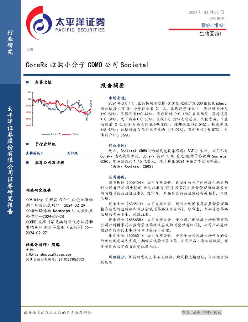 太平洋证券:生物医药Ⅱ行业周报:CoreRx收购小分子CDMO公司Societal.pdf