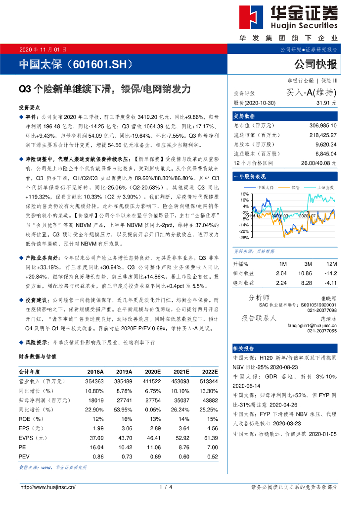 华金证券:中国太保(601601)-Q3个险新单继续下滑,银保/电网销发力.pdf