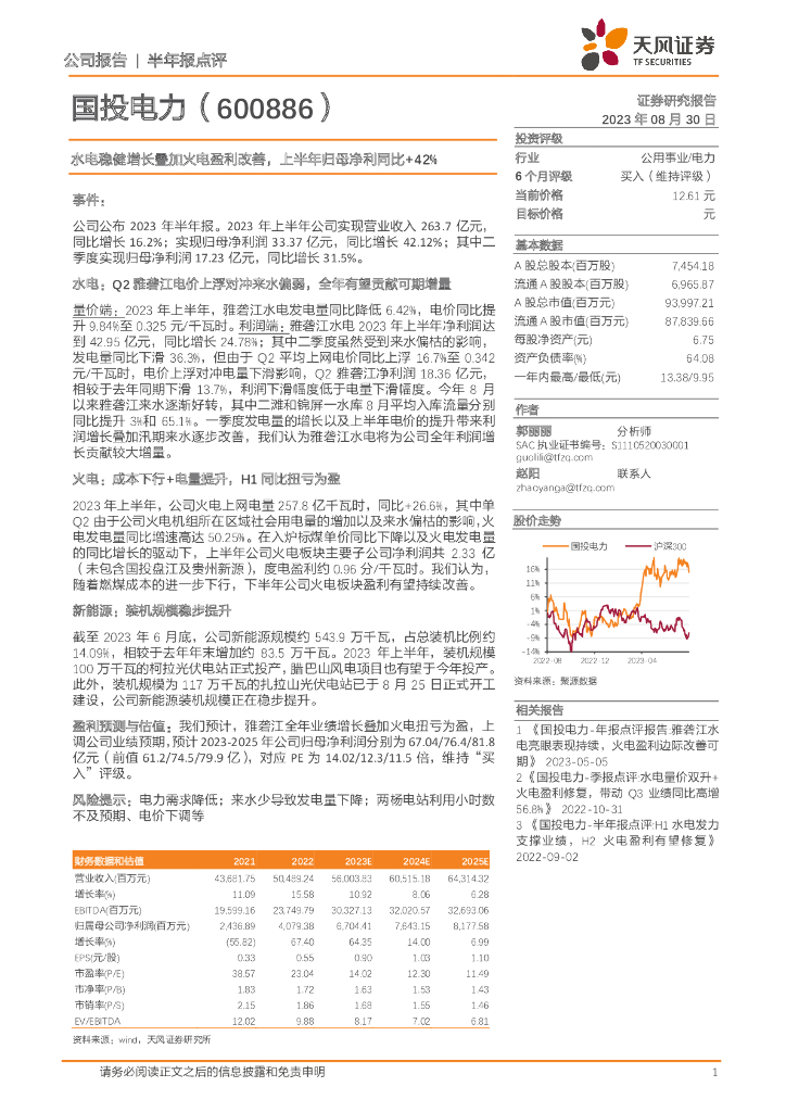 天风证券:国投电力(600886)-水电稳健增长叠加火电盈利改善,上半年归母净利同比+42%.pdf