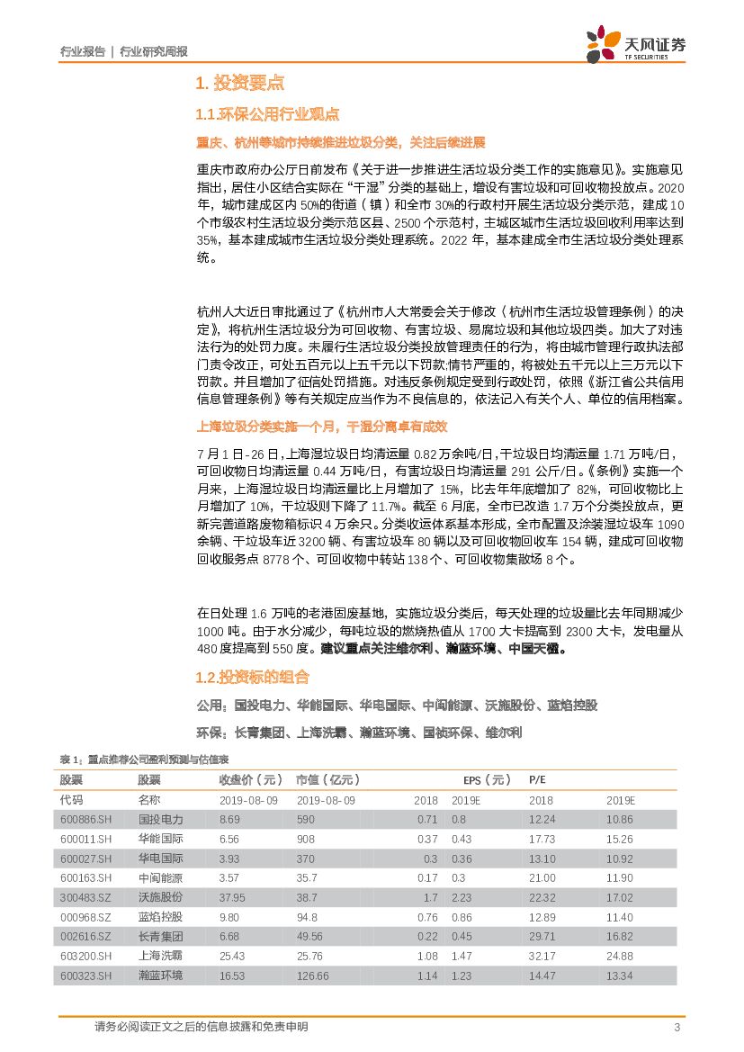 天风证券:公用事业行业研究周报:重庆、杭州等城市持续推进垃圾分类,关注后续进展.pdf