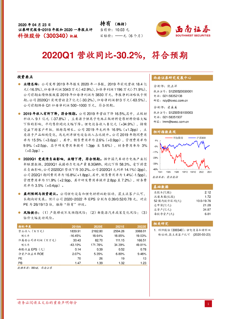 西南证券:科恒股份(300340)-2020Q1营收同比-30.2%,符合预期.pdf