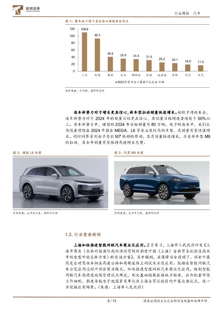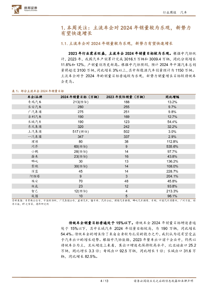 德邦证券:汽车行业周报:主流车企对2024年销量较为乐观,新势力有望快速增长.pdf