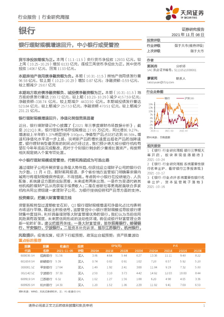 天风证券:银行行业研究周报:银行理财规模增速回升,中小银行或受管控.pdf