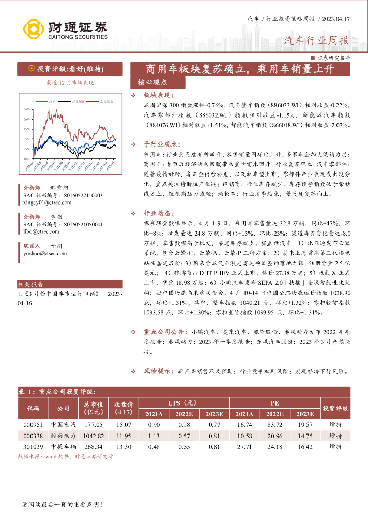 财通证券:汽车行业周报:商用车板块复苏确立,乘用车销量上升.pdf