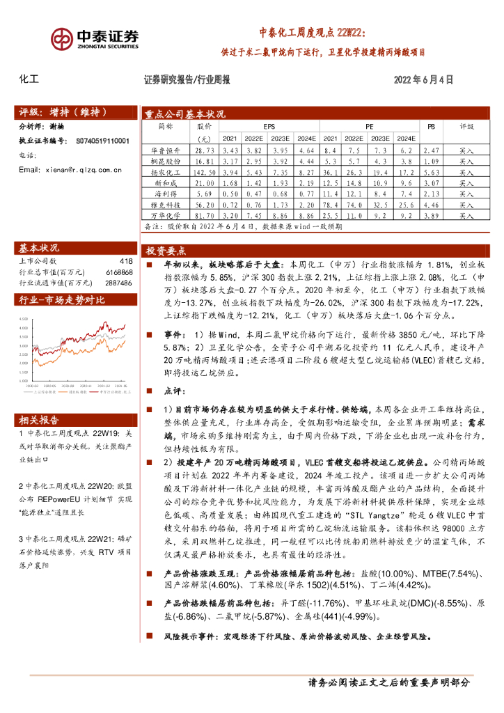 中泰证券:中泰化工周度观点22W22:供过于求二氯甲烷向下运行,卫星化学投建精丙烯酸项目.pdf