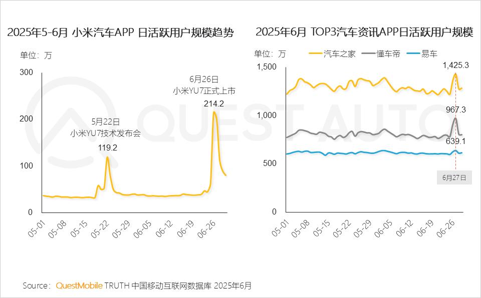 2.1小米YU7发布引发市场强烈关注,小米汽车APP日活创新高,同时带动汽车资讯APP流量的显著提升