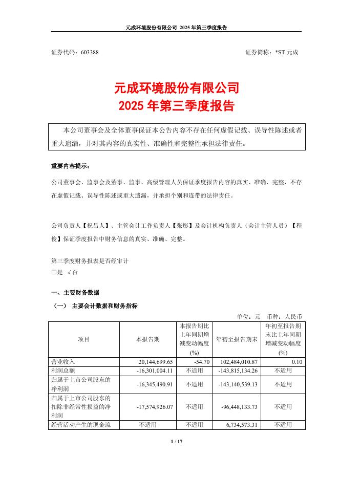 603388-*ST元成:元成环境股份有限公司2025年三季度报告.pdf