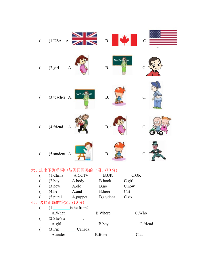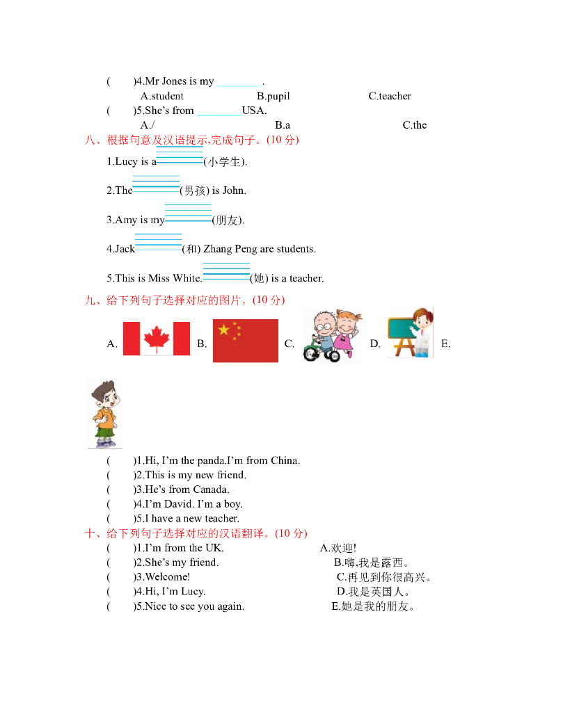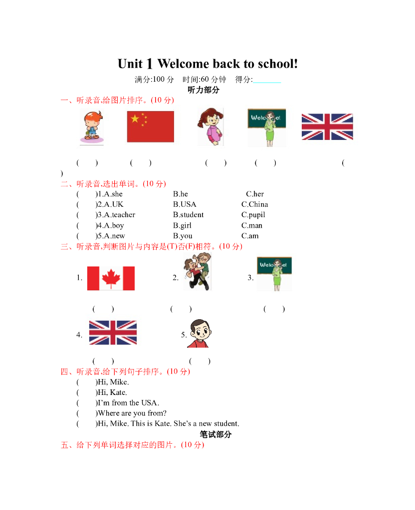 人教三下 Unit 1 单元测试卷.doc
