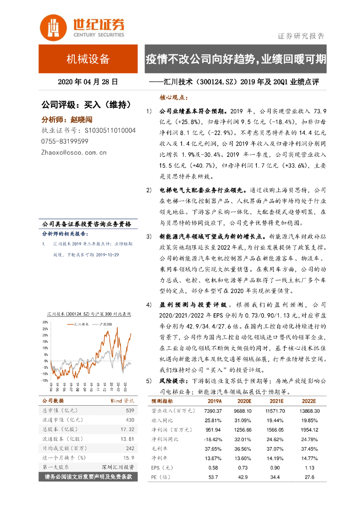 世纪证券:汇川技术(300124)-2019年及20Q1业绩点评:疫情不改公司向好趋势,业绩回暖可期.pdf