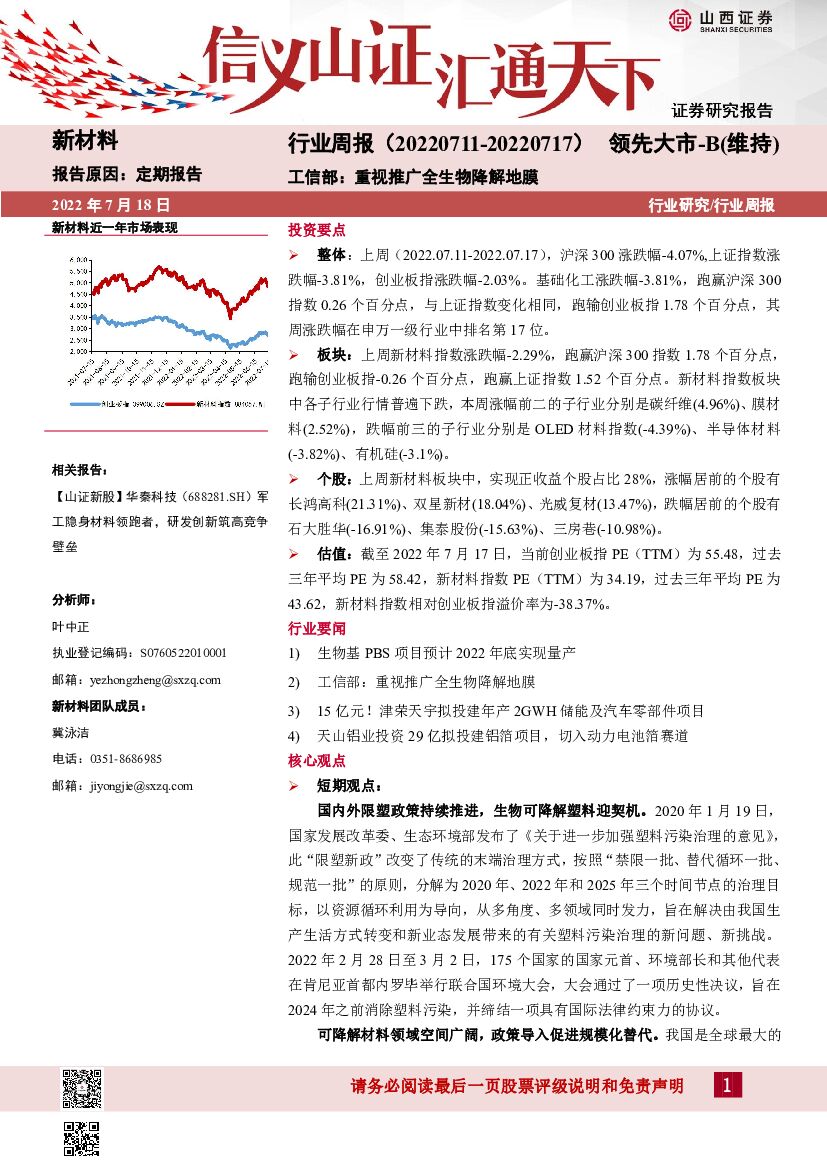 山西证券:新材料行业周报:工信部:重视推广全生物降解地膜.pdf