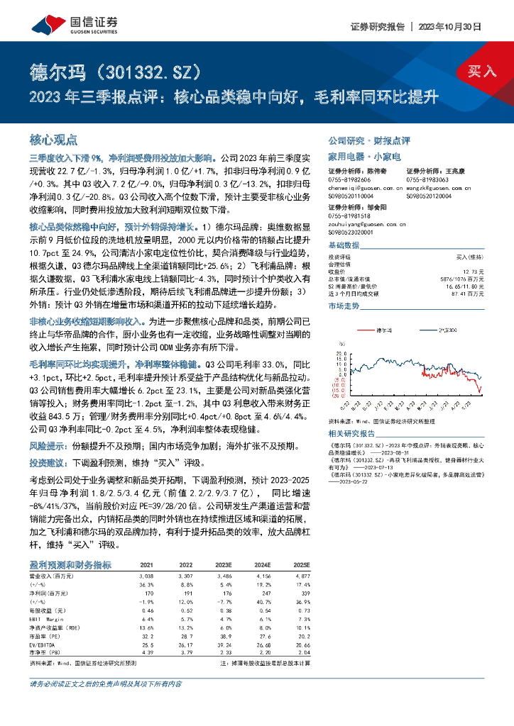 国信证券:德尔玛(301332)-2023年三季报点评:核心品类稳中向好,毛利率同环比提升.pdf