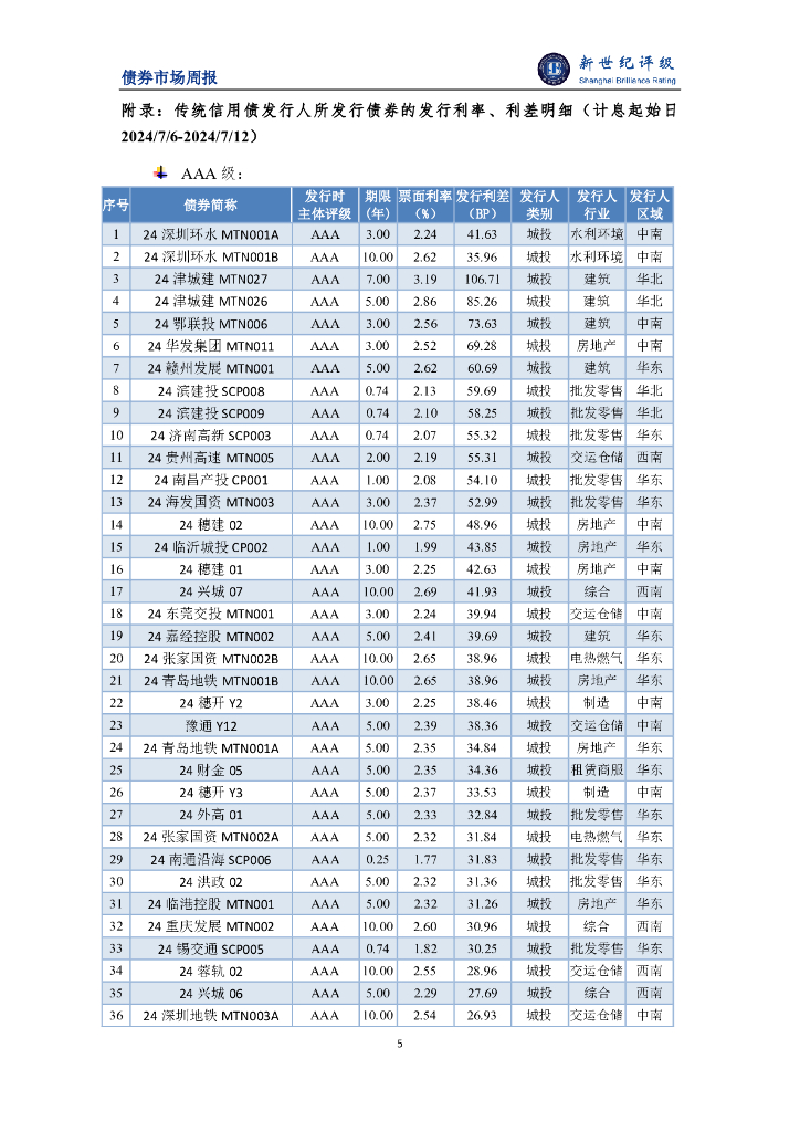 新世纪评级:债券发行环比大幅增长 发行利率利差环比小幅回升——债券市场周报(2024/7/6-7/12).pdf