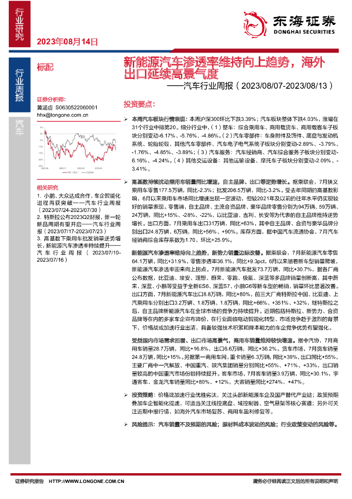 东海证券:汽车行业周报:新能源汽车渗透率维持向上趋势,海外出口延续高景气度.pdf