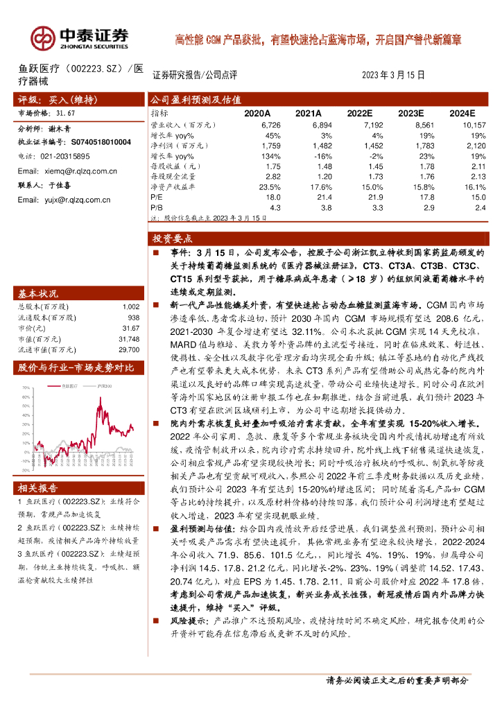 中泰证券:鱼跃医疗(002223)-高性能CGM产品获批,有望快速抢占蓝海市场,开启国产替代新篇章.pdf