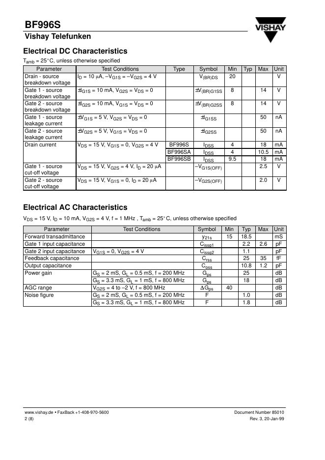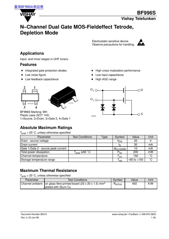VISHAY BF996S N–Channel Dual Gate MOS-Fieldeffect Tetrode, Depletion Mode 数据手册.pdf