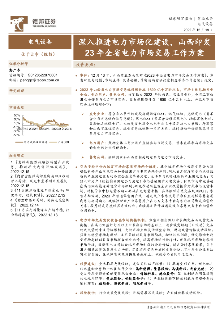 德邦证券:电气设备:深入推进电力市场化建设,山西印发23年全省电力市场交易工作方案.pdf
