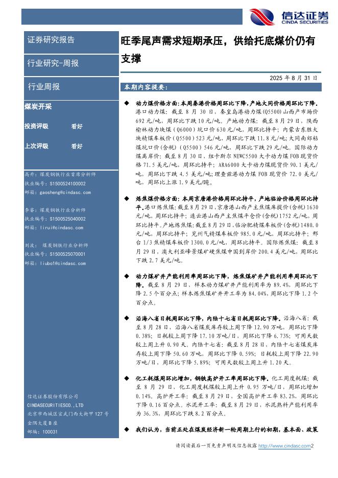 信达证券:煤炭开采行业周报:旺季尾声需求短期承压,供给托底煤价仍有支撑.pdf