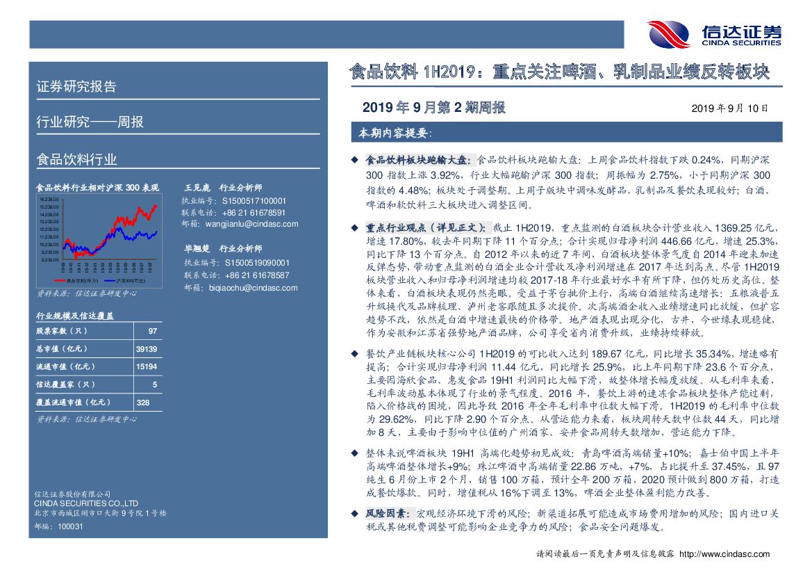 信达证券:食品饮料2019年9月第2期周报:食品饮料1H2019:重点关注啤酒、乳制品业绩反转板块.pdf