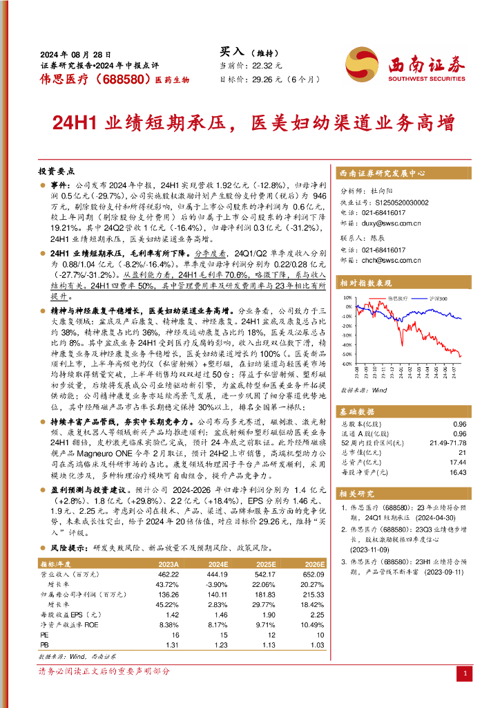西南证券:伟思医疗(688580)-2024年中报点评:24H1业绩短期承压,医美妇幼渠道业务高增.pdf