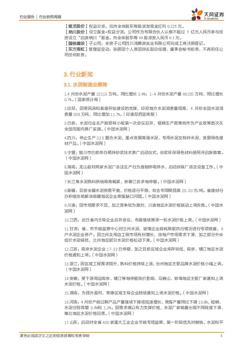 天风证券:建筑材料行业研究周报:持续关注二季度水泥限产对价格的支撑作用,及地产严购下的真装修需求对消费建材的业绩支持.pdf