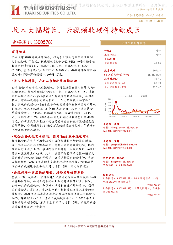 华西证券:会畅通讯(300578)-收入大幅增长,云视频软硬件持续成长.pdf