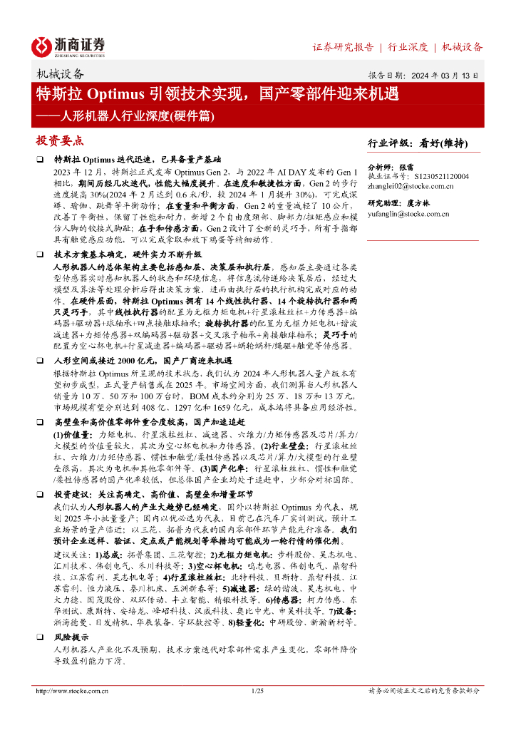 浙商证券:人形机器人行业深度(硬件篇)-特斯拉Optimus引领技术实现,国产零部件迎来机遇.pdf