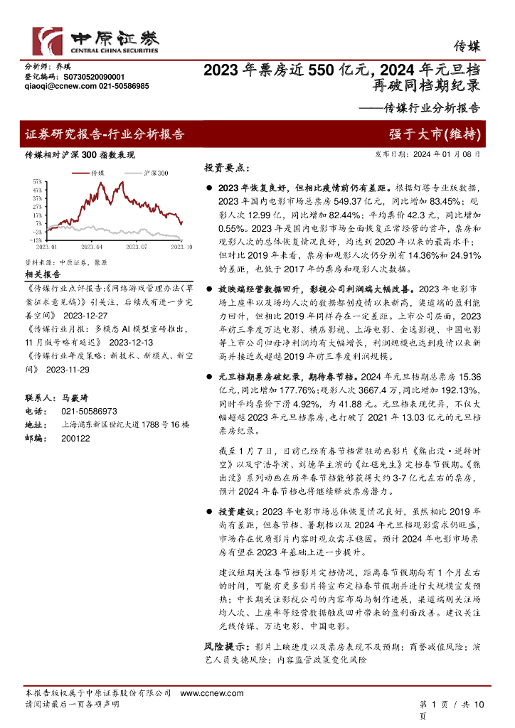 中原证券:传媒行业分析报告:2023年票房近550亿元,2024年元旦档再破同档期纪录.pdf