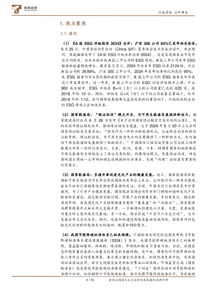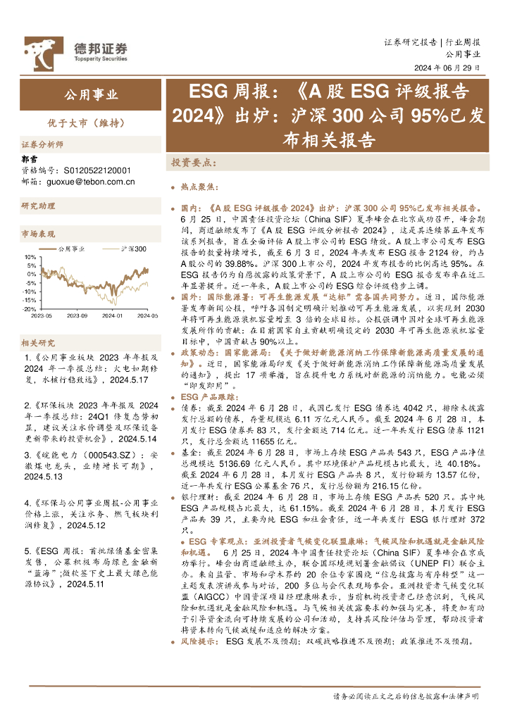 德邦证券:公用事业行业ESG周报:《A股ESG评级报告2024》出炉,沪深300公司95%已发布相关报告.pdf