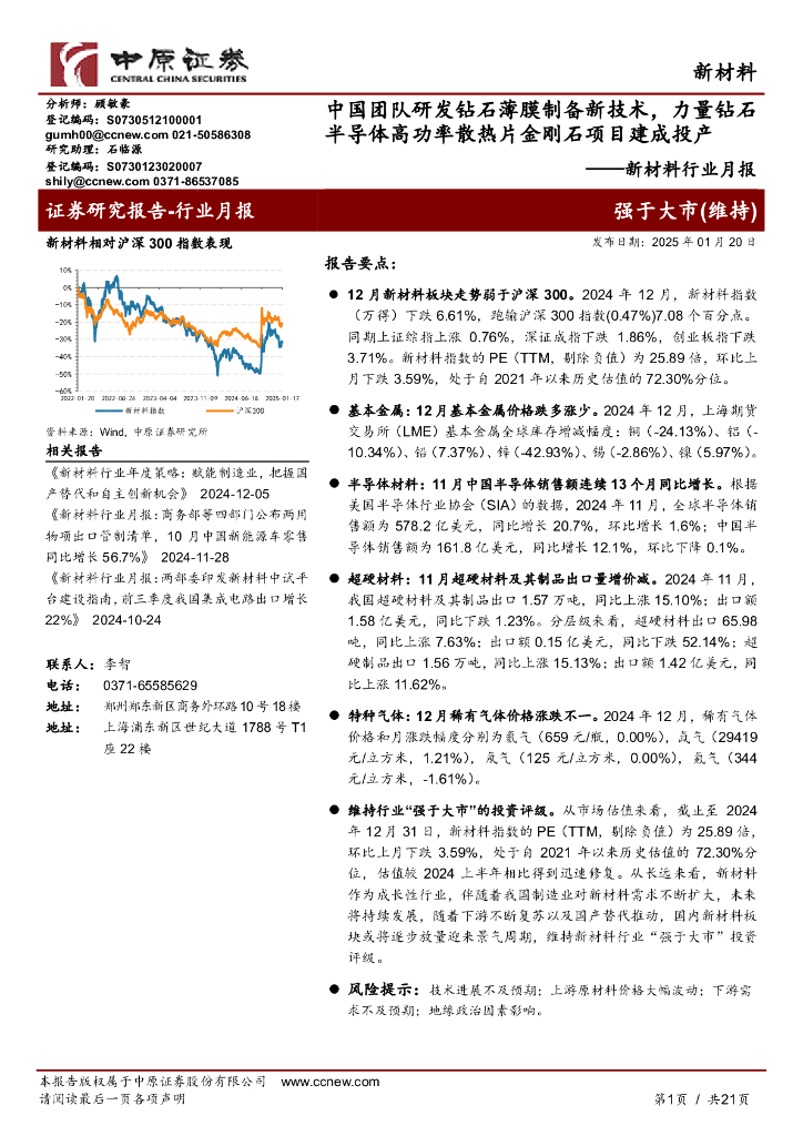 中原证券:新材料行业月报:中国团队研发钻石薄膜制备新技术,力量钻石半导体高功率散热片金刚石项目建成投产.pdf