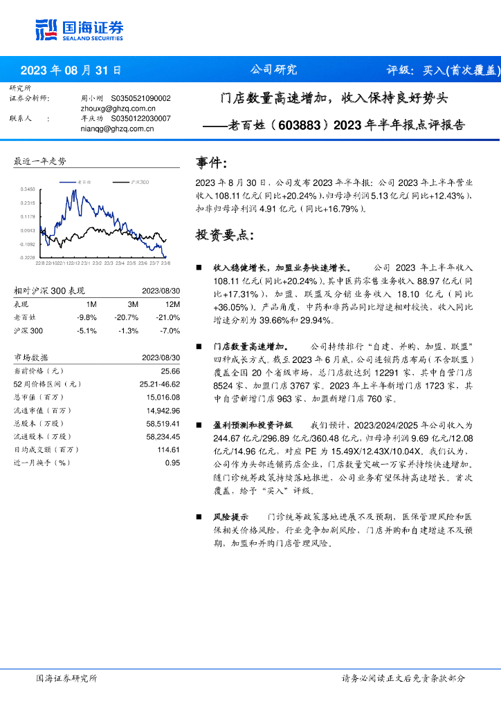 国海证券:老百姓(603883)-2023年半年报点评报告:门店数量高速增加,收入保持良好势头.pdf