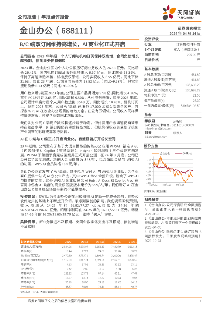 天风证券:金山办公(688111)-B/C端双订阅维持高增长,AI商业化正式开启.pdf
