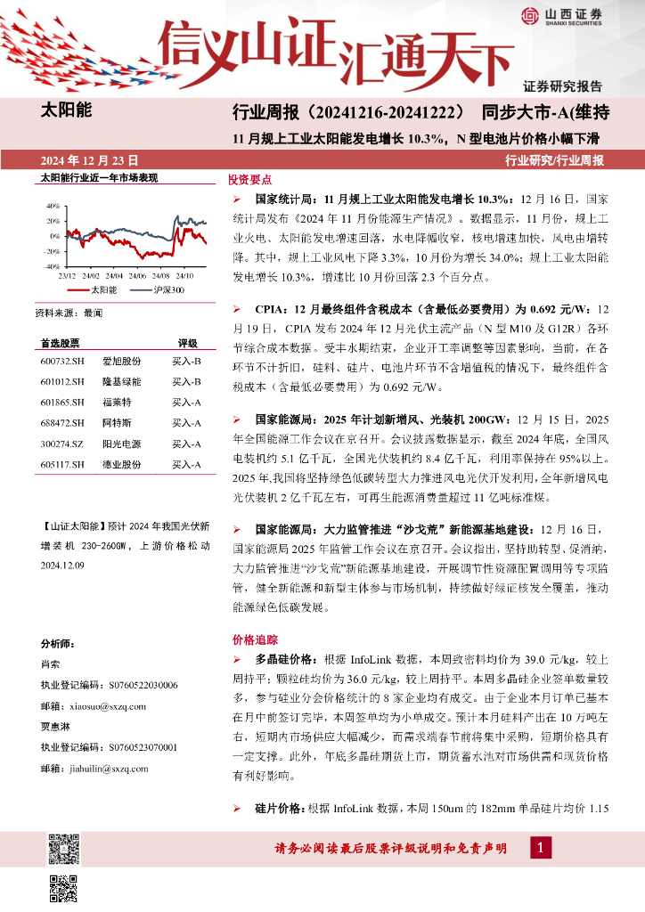 山西证券:太阳能行业周报:11月规上工业太阳能发电增长10.3%,N型电池片价格小幅下滑.pdf