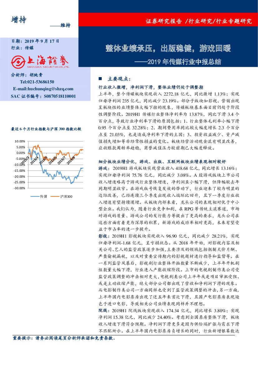 上海证券:2019年传媒行业中报总结:整体业绩承压,出版稳健,游戏回暖.pdf