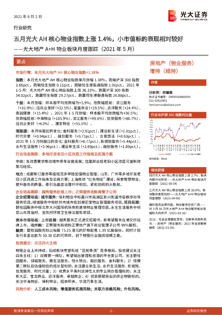 光大证券:光大地产A+H物业板块月度跟踪(2021年5月):五月光大AH核心物业指数上涨1.4%,小市值标的表现相对较好.pdf