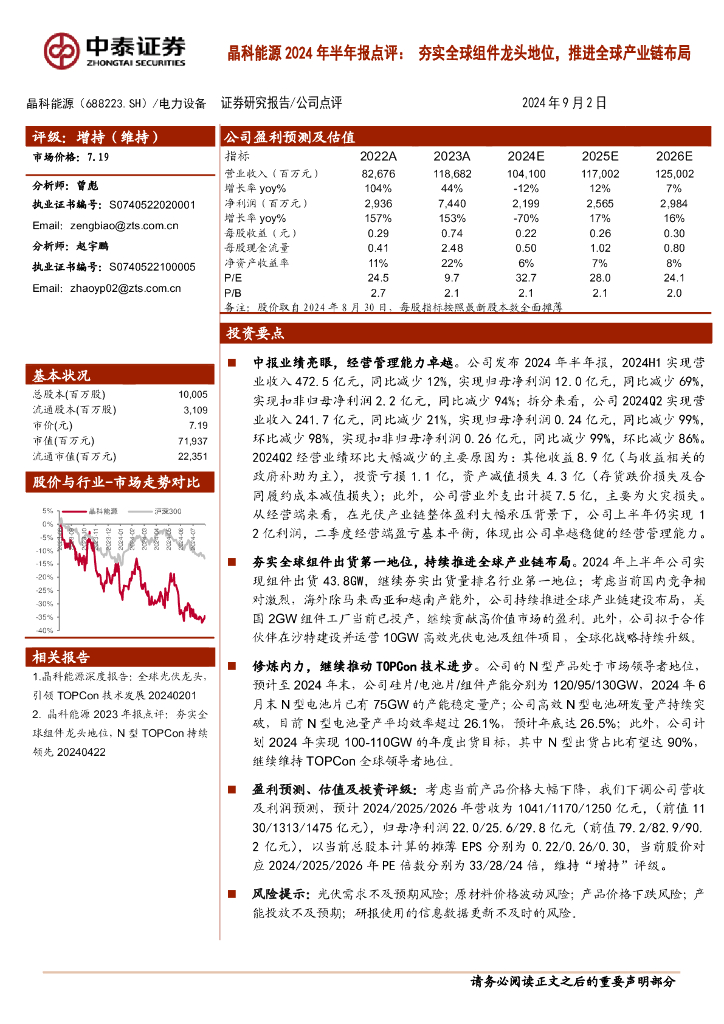 中泰证券:晶科能源(688223)-2024年半年报点评:夯实全球组件龙头地位,推进全球产业链布局.pdf