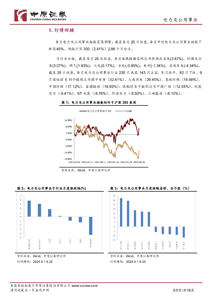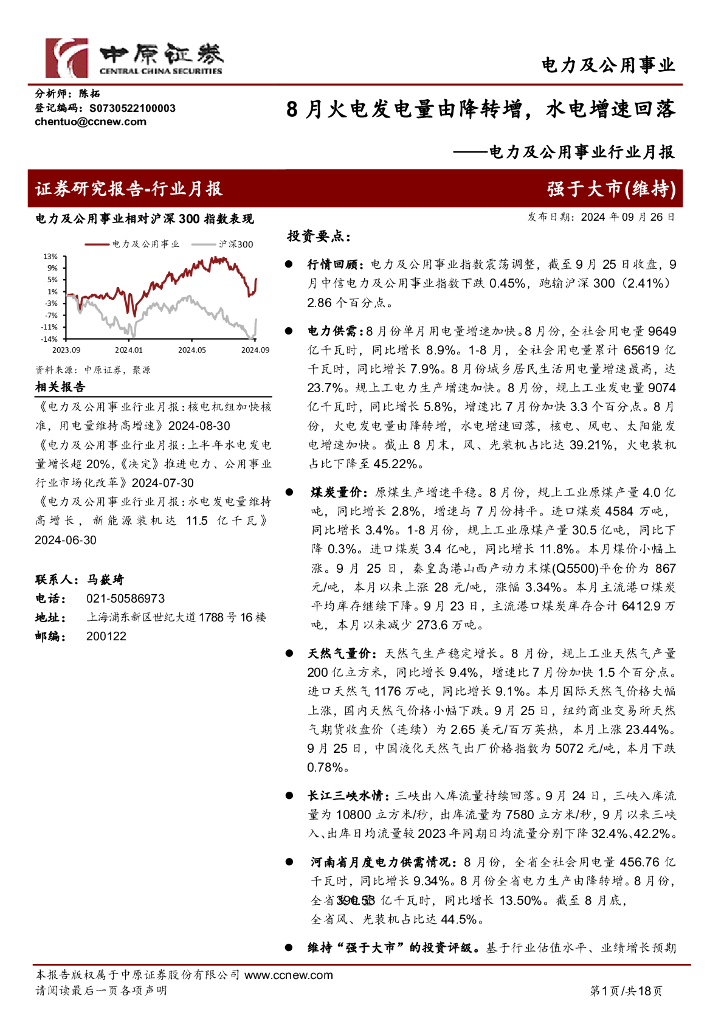 中原证券:电力及公用事业行业月报:8月火电发电量由降转增,水电增速回落.pdf