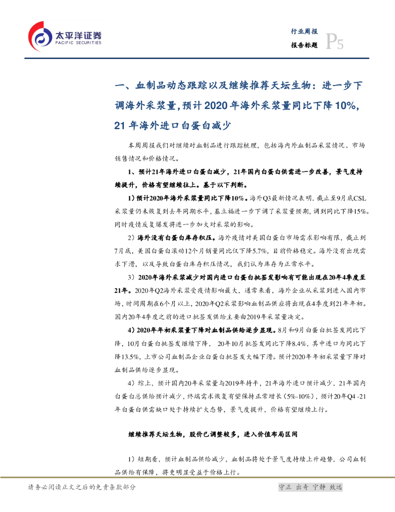 太平洋证券:医药周报:预计2020年海外采浆量同比下降10%,继续推荐天坛生物.pdf