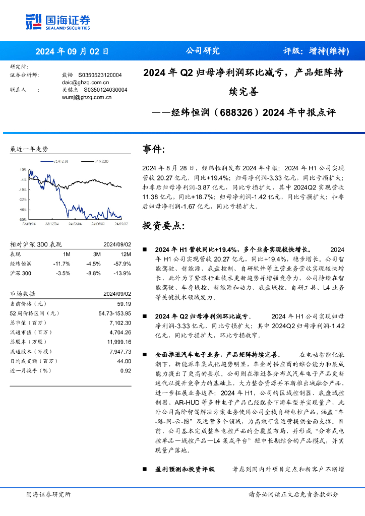 国海证券:经纬恒润(688326)-2024年中报点评:2024年Q2归母净利润环比减亏,产品矩阵持续完善.pdf