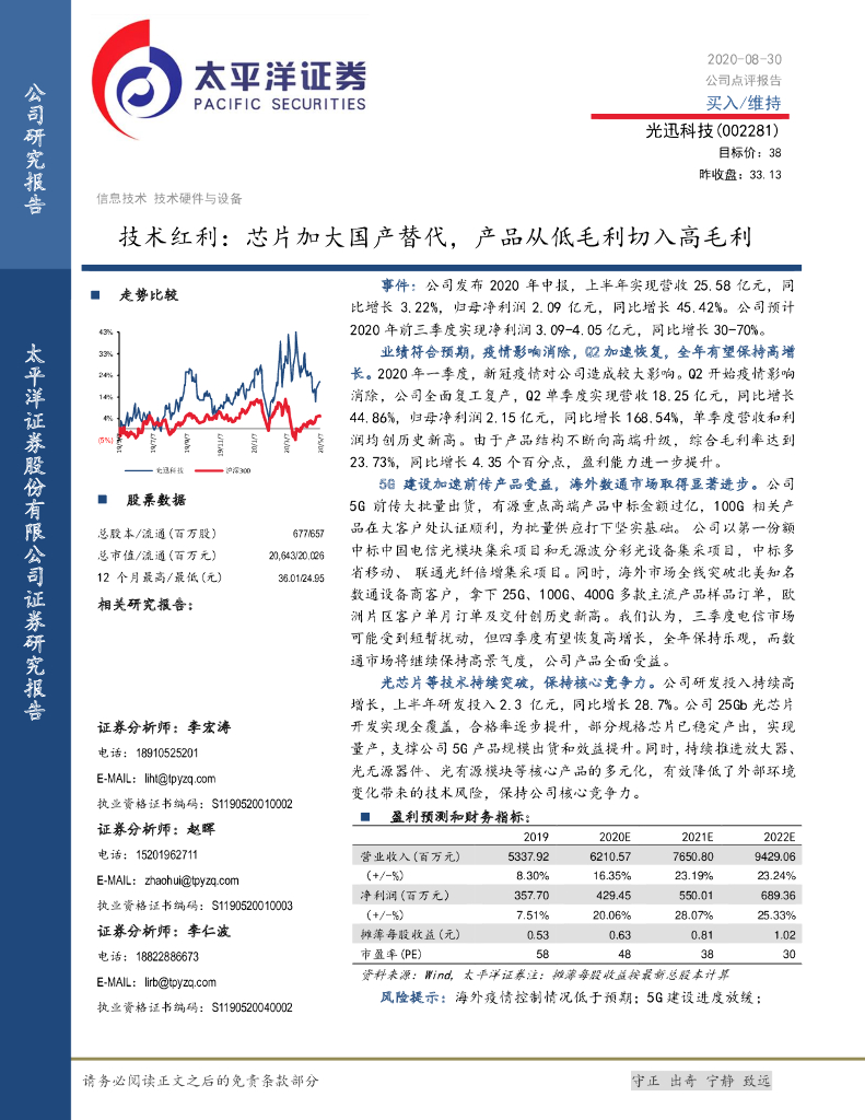 太平洋证券:光迅科技(002281)-技术红利:芯片加大国产替代,产品从低毛利切入高毛利.pdf