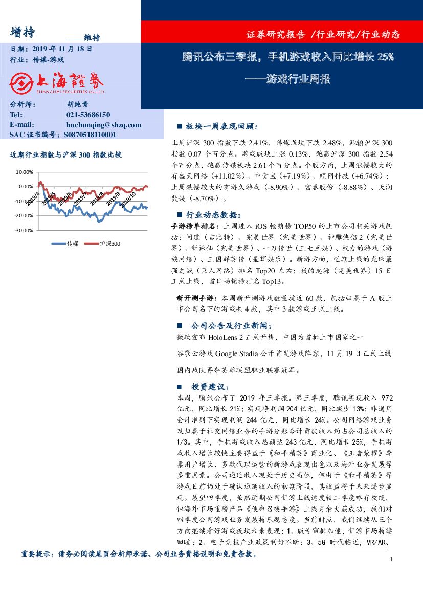 上海证券:游戏行业周报:腾讯公布三季报,手机游戏收入同比增长25%.pdf
