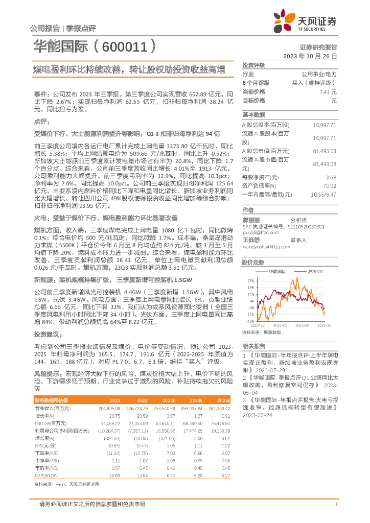 天风证券:华能国际(600011)-煤电盈利环比持续改善,转让股权助投资收益高增.pdf