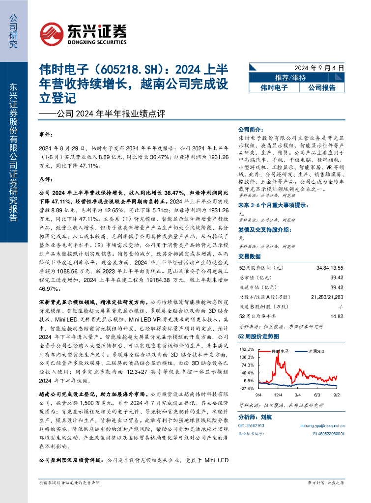 东兴证券:伟时电子(605218)-公司2024年半年报业绩点评:2024上半年营收持续增长,越南公司完成设立登记.pdf