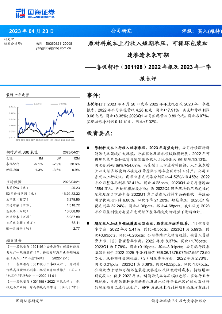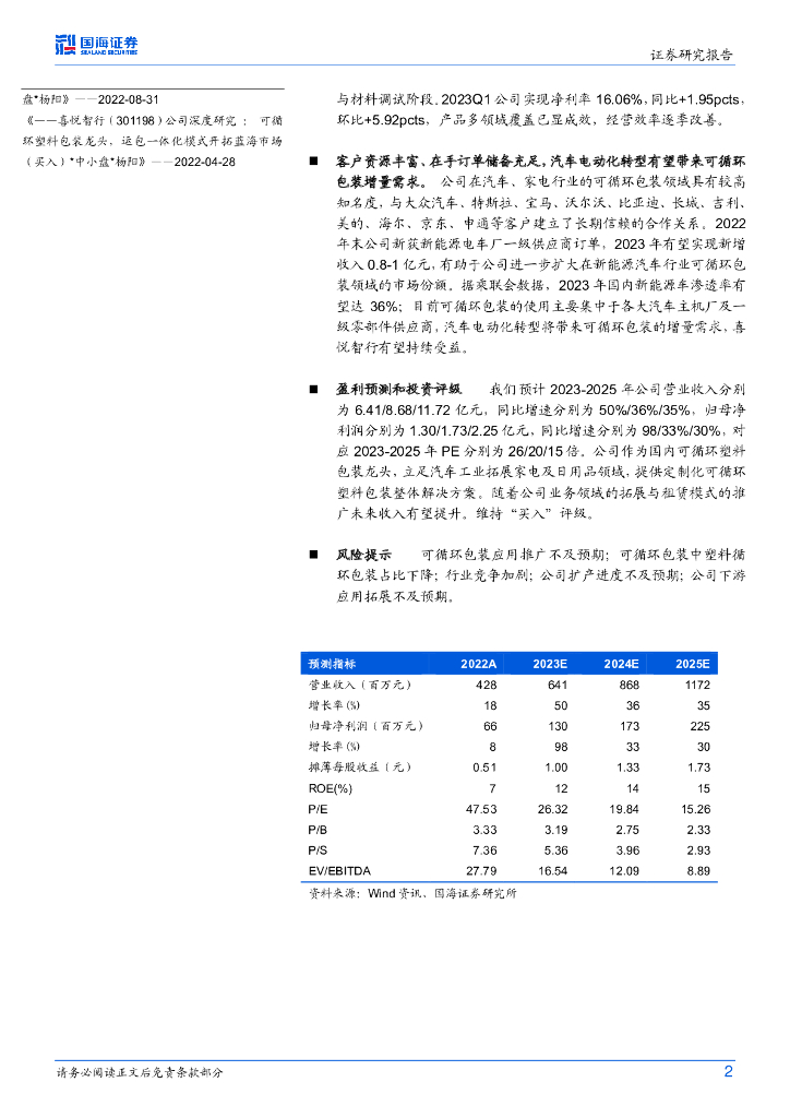 国海证券:喜悦智行(301198)-2022年报及2023年一季报点评:原材料成本上行收入短期承压,可循环包装加速渗透未来可期.pdf