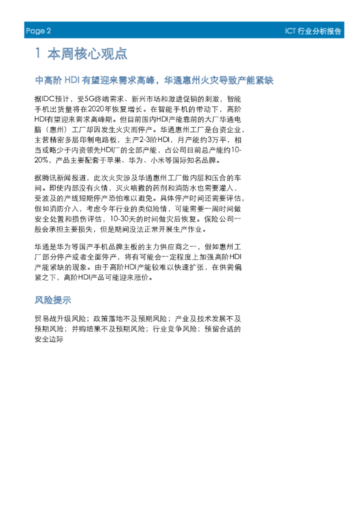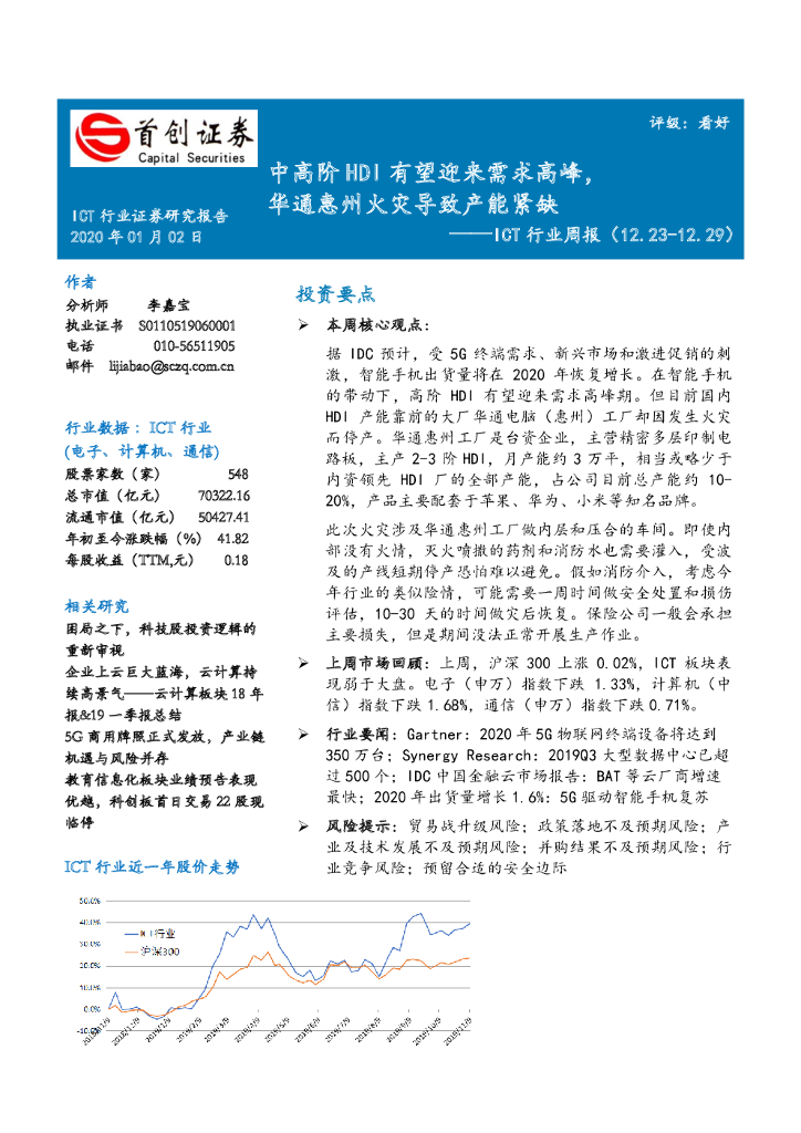 首创证券:ICT行业周报:中高阶HDI有望迎来需求高峰,华通惠州火灾导致产能紧缺.pdf