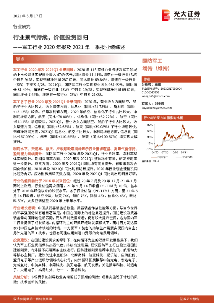 光大证券:军工行业2020年报及2021年一季报业绩综述:行业景气持续,价值投资回归.pdf