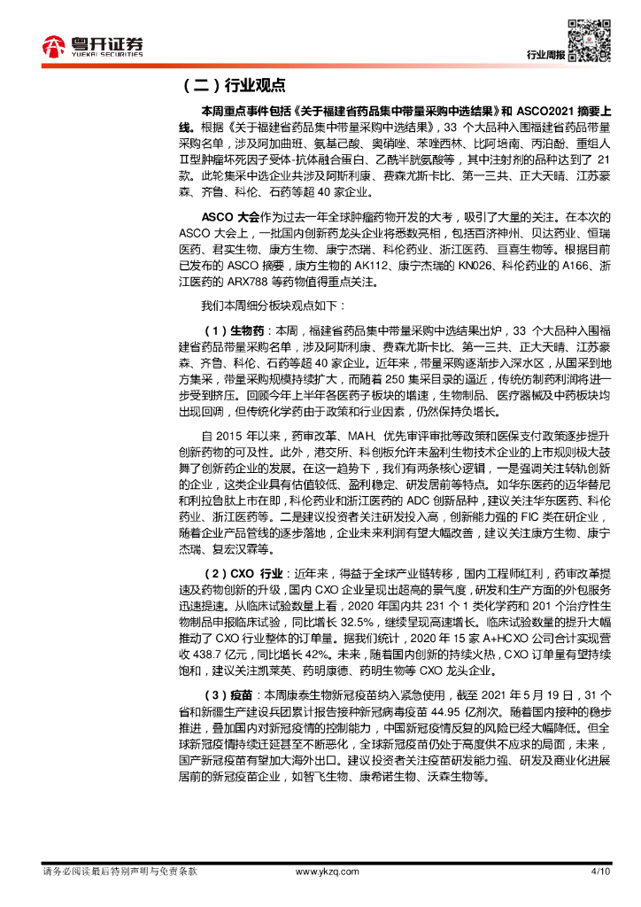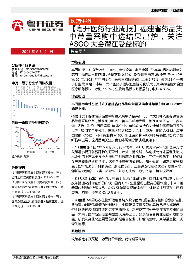 粤开证券:【粤开医药行业周报】福建省药品集中带量采购中选结果出炉,关注ASCO大会潜在受益标的.pdf